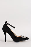 Light up the room with these beautiful pointy toe pumps! Featuring faux suede upper, pointy toe, pearl and rhinestone vamp decor, ankle strap with adjustable buckle closure, wrapped heel, stitching detail, and finished with cushioned insole for comfort.