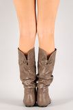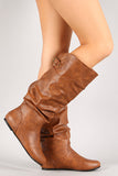 Featuring leatherette upper, slouchy shaft design, buckled strap embellishment at back, stitching detail, round toe, low flat heel, smooth interior lining, in an easy slip-on style.