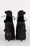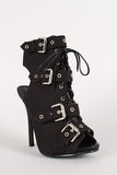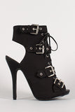 This stylish heel features a peep toe front, partially hidden platform, wrapped stiletto heel, adjustable buckle straps with lace up closure, inner side zip closure for easy on/off, and finished with lightly padded insole for comfort.