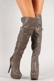 Featuring almond toe, chunky platform, wrapped stiletto heel, corset style straps at back, adjustable buckle strap, partial side zipper closure, stitching detail, and finished with cushioned insole for comfort.