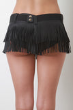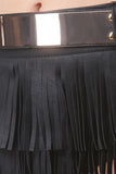This statement-making belt features a wide vegan leather main, double layered fringe, and metallic plate front. Finished with elastic band and double snap button closure for a one-size-fits-most fit.