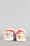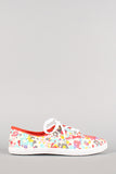 Featuring floral fabric upper, fabric trim, lace up front, stitching detail, round toe, and low flat heel.