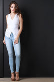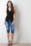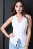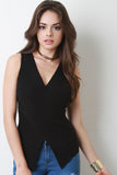 This sleeveless top features soft rib knit, deep v-neckline with overlap design, and tulip hem. Accessories sold separately. 55% Viscose, 45% Nylon.