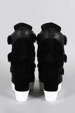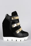 This high top sneaker features a round toe, combination of faux suede/leatherette upper, and lug sole platform wedge heel. Finished with padded collar/tongue, cushioned insole, and triple metallic strap closure.