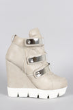 This high top lug sole platform wedge heel, and triple metallic strap closure. Finished with padded collar/tongue and cushioned insole for comfort.
