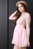 This bell-shaped dress features a v-neck floral lace top, half sleeves, and a voluminous skirt. Top unlined. Accessories sold separately. Made in U.S.A. 90% Nylon, 10% Spandex.