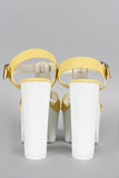 This platform comes in trending pastel colors. The crisscrossing straps and chunky heel make this shoe versatile for the summer. Finished with an embossed texture along the outsole of the faux wood.