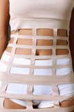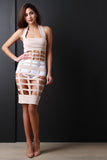 This  dress  features smooth stretch fabric, u-shaped neckline, halter straps, cut out grid design, and midi length. Accessories sold separately. Made in U.S.A. 95% Polyester, 5% Spandex.