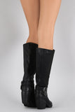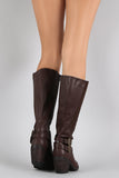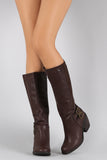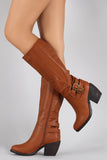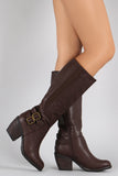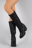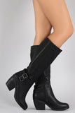 This classic knee high length on a stacked heel. It has a classic silhouette with its two side buckles, stitching details, and a side zipper. Features elastic gores on the outer sides for a custom fit design. Finished with light faux fur on the inside.