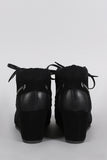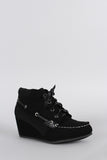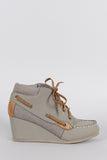 These wedge booties have a boat shoe silhouette; featuring mixed media design and tonal color blocking. It is lace up design. Finished with a lightly padded collar.