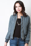 This timeless bomber jacket features a zip-up front, long sleeves with zipper pocket on left side, side pockets with snap button, ribbed knit trimming, and contrasting lining. Accessories sold separately. 100% Polyester.