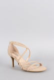 This glamorous heel features an open toe silhouette, strappy construction, wrapped kitten heel, crisscross ankle strap with buckle closure, and lightly padded insole for comfort.
