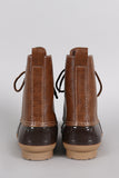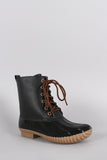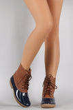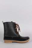 These duck ankle boots feature a combination of vegan leather/PVC upper, top stitching details, pull-on tab, and low heel. Finished with cushioned insole, soft interior lining, and lace up front closure.
