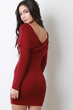 This dress features a fully lined knit fabrication with a butterfly cross on the front leading to the shoulders and a slight open back. Has a v-neck with long sleeves and is mini in length. Accessories sold separately. Made in U.S.A. 95% Rayon, 5% Spandex.