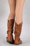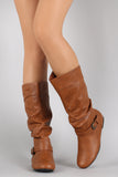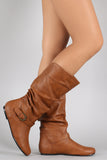 These flat boots are mid calf length, depending on personal height. Designed with a slouchy shaft and an adjustable buckle across the vamp. Lightly padded lining.