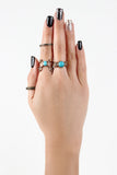 This set of four rings features a crossed arrow ring with a faux turquoise center, a turquoise ring with fletching accents, and two textured thin bands. Bands are not adjustable.