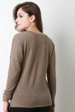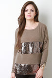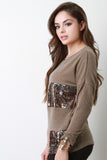 This long sleeve top features soft knit, sequin panels, round neckline, and dropped shoulders. Accessories sold separately. Made in U.S.A. 96% Polyester, 4% Spandex.