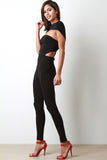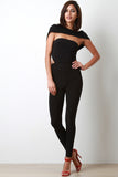 This strapless jumpsuit features a tube neckline, side cutout to an open back, high waisted seam, back panel sash for an off-the-shoulder wear, and taper cut leggings. Accessories sold separately. Made in U.S.A. 96% Polyester, 4% Spandex.