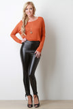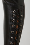 These lace-up design at the sides of the calves with matte metallic eyelets and an elastic waistband. Accessories sold separately. Self: 100% Polyurethane. Base Fabric: 91% Rayon, 9% Spandex.