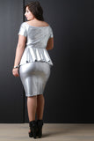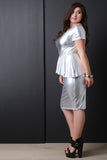 This plus size dress features a shiny knit fabrication with a semi-wide, round neckline along with a bodycon design and a peplum skirt starting from the center. The peplum skirt has a little of a shark bite design in the front where the front is higher than the sides. Accessories sold separately. Made in U.S.A. 96% Polyester, 4% Spandex.