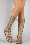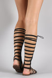 This knee-high gladiator sandal features glossy vegan snake leather straps with round cord lacing, open toe, and elastic straps at the back for a stretchy fit. Finished with a full-length side zipper closure for easy on/off.