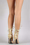 This heel features a metallic fabric upper with cutout detail, lace up construction, and wrapped stiletto heel. Finished with lightly padded insole and rear zipper closure for easy on/off.