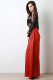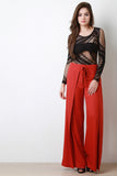These palazzo pants feature a hook and bar closure and has a self tie that is attached to additional flaps starting from the center of the leg. Accessories sold separately. 100% Polyester.