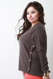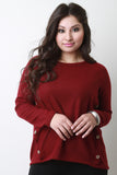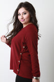 A plus size knit top featuring a round crew neck, long sleeves, and slanted faux button-up sides. Accessories sold separately. Made in U.S.A. 97% Polyester, 3% Spandex.