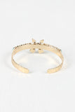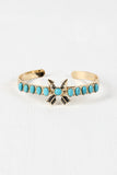 An open-ended  bracelet  featuring a hammered metallic band, a crossed arrow motif at the front, and oval faux turquoise stones. Nickel, lead, and cadmium compliant.