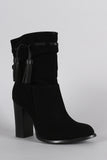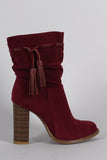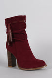These chic ankle boots feature an almond toe silhouette, vegan leather ankle strap with tassel detail, slouchy shaft, and chunky stacked heel. Finished with cushioned insole, smooth interior lining, and side zipper closure for easy on/off.