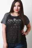 This plus size top features a soft marled knit fabrication with a screen print "QUEEN LOOK SO COOL", round neckline, short sleeves design, and a rounded hemline. Accessories sold separately. Made in U.S.A. 38% Polyester, 62% Rayon.