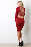 This bodycon dress features a mock turtle neckline, long sleeves, sculpturing silhouette, knee length hemline, backless construction with corset lace-up design. Accessories sold separately. Made in U.S.A. 95% Polyester, 5% Spandex.