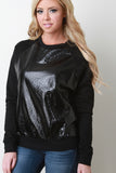 This pullover long sleeve top features embossed vegan leather and knit, round neckline, long raglan sleeves. Accessories sold separately. Shell1: 80% Cotton, 20% Polyester. Shell2: 100% PU.