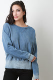 This pullover top features faded washed denim fabric, round neckline, dropped shoulders, and long sleeves. Accessories sold separately. Shell 1: 95% Cotton, 5% Spandex. Shell 2: 94% Cotton, 6% Spandex.