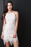 This  dress  features floral lace, round neckline, adjustable spaghetti straps, back cutouts with self-tie sash, and lining. Accessories sold separately. Shell: 100% Nylon. Lining: 100% Polyester.