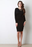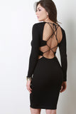 This sleek bodycon dress features a round neckline, long sleeves, backless design with lace-up construction, and a sculpture fit. Accessories sold separately. Made in U.S.A. 97% Modal, 3% Lycra.