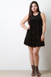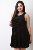 A plus size sleeveless burnout velvet front, and jersey knit back. Partially lined. Accessories sold separately. Made in USA. Self: 93% Polyester, 7% Spandex. Contrast 1: 95% Rayon, 5% Spandex. Contrast 2: 100% Polyester.
