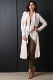 A long cardigan in ruffling crepe fabric with a splayed collar, long sleeves, and self-tie belt. Accessories sold separately. Made in U.S.A. 100% Polyester.