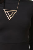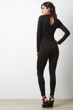 This sleek body sculpturing jumpsuit features a mock neckline, long sleeves, high waisted cinched seam, taper cut legs, and a keyhole back to a single button closure at nape. Accessories sold separately. Made in U.S.A. 92% Polyester, 8% Spandex.
