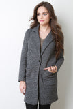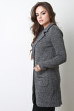 This longline coat features a notch collar, open front with a single button closure, long sleeves, and double front pockets. Accessories sold separately. 62% Polyester, 14% Cotton, 12% Rayon, 6% Acrylic, 2% Wool.