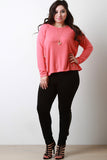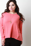 This  plus size top  features a soft knit fabrication, round neckline, and side buttons accent. Finished with long sleeves and high-low hemline. Accessories sold separately. Made in U.S.A. 79% Polyester, 18% Rayon, 3% Spandex.