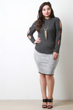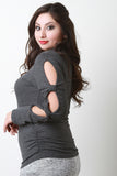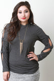 A plus size top featuring a stretchy ribbed knit, mock neckline, and long cutout sleeves with bow-like accents. Finished with a round hem and ruched sides. Includes a long jointed necklace with glossy gold-tone tubes, curb link chain fringe, and rhinestone accents. Other accessories sold separately. 97% Rayon, 3% Spandex.
