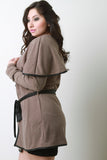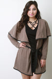 A plus size knit cardigan featuring a cape-like tier, open front with self-tie belt, and vegan leather trim. Accessories sold separately. Self: 95% Polyester, 5% Spandex. Contrast: 96% Polyester, 4% Spandex.