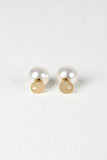 These trendy double-sided earrings feature a brushed metal circle front, post back, and circle cutout accent with a large faux pearl back.