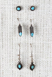 This set of three pairs of earrings features round studs with textured bezels, fishhook-backed feather earrings, and kidney wire earrings with oval charms.