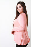 A plus size top featuring a v-neckline with criss-crossing strap accents, long sleeves, and a relaxed trapeze fit. Accessories sold separately. Made in U.S.A. 96% Rayon, 4% Spandex.