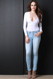 This bodysuit features a plunging v-neckline, long sleeves, high waisted cinched seam, brief bottom, and a double snap button closure at crotch. Accessories sold separately. Made in U.S.A. 95% Polyester, 5% Spandex.