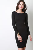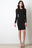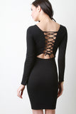 This bodycon dress features a corset lace-up back, round neckline, and long sleeves. Accessories sold separately. Made in U.S.A. 95% Polyester, 5% Spandex.