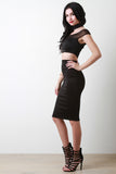 This dress features a boat neckline, semi-sheer mesh yoke, keyhole cutout at back, connected wide choker panel with hook-n-eye closure, and a crop hemline. Bottom features a seamless elasticized high waist design, stretchy sculpture fit, and a zipper back. Accessories sold separately. Made in U.S.A. 95% Polyester, 5% Spandex.