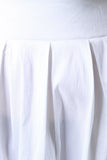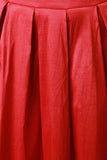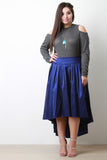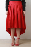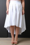 A plus size midi skirt featuring crisp taffeta fabric, box pleats, and a wide waistband with self-tie bow back. Finished with an A-line shape, high-low hemline, and side zipper closure. Accessories sold separately. 100% Polyester. Contrast: 95% Polyester, 5% Spandex.